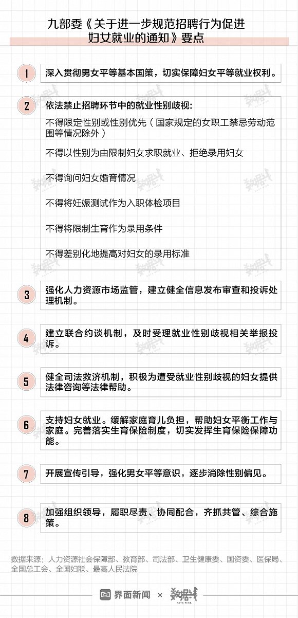 2019年2月,人力资源社会保障部、教育部等九部委印发的《关于进一步规范招聘行为促进妇女就业的通知》指出,要深入贯彻男性平等的基本国策,强化男女平等意识,切实保障妇女平等就业的权利,禁止招聘环节中的就业性别歧视行为。