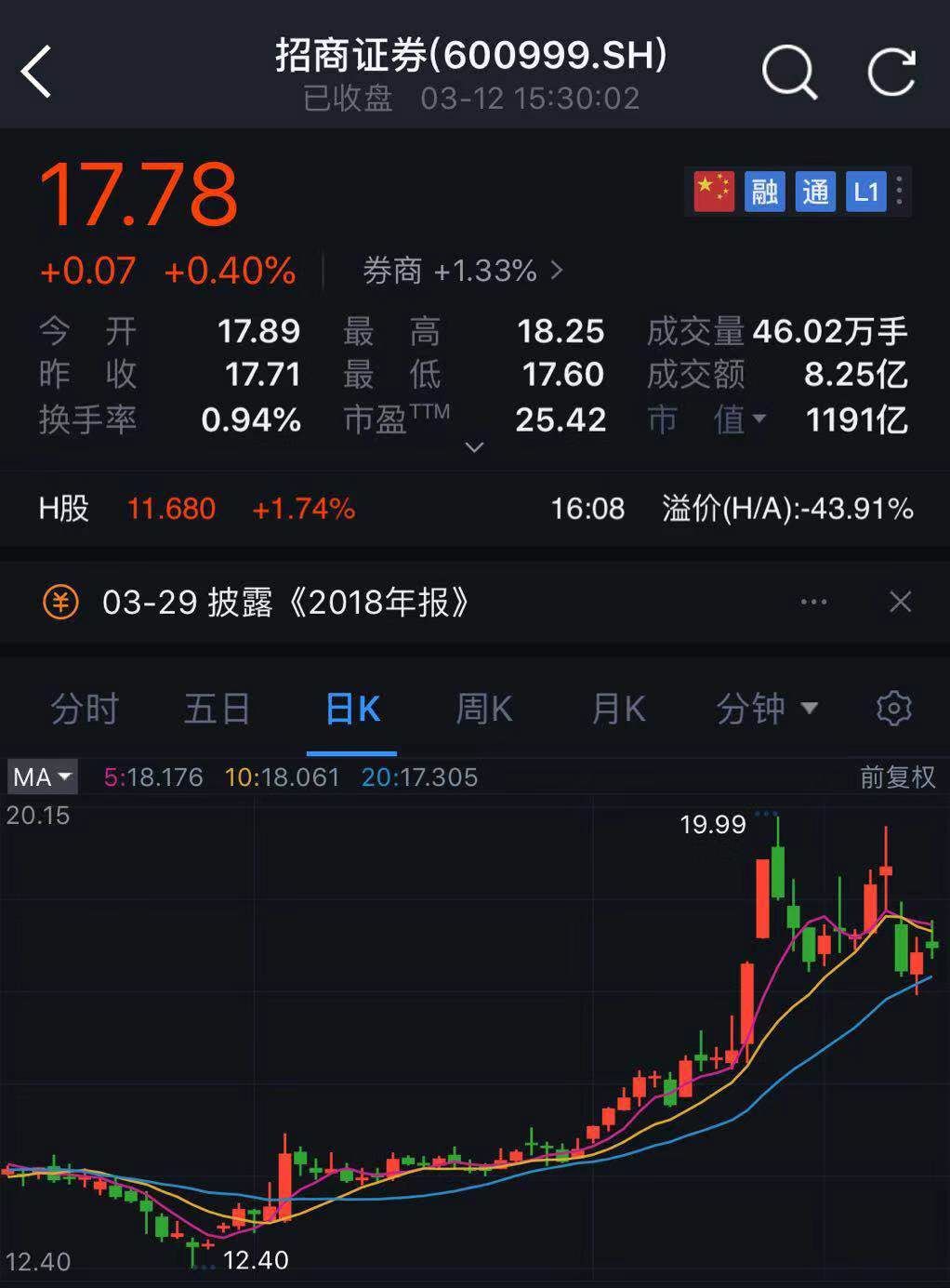 目前A股招商证券的股价是17.78元/股,也就是说还有50%的空间。