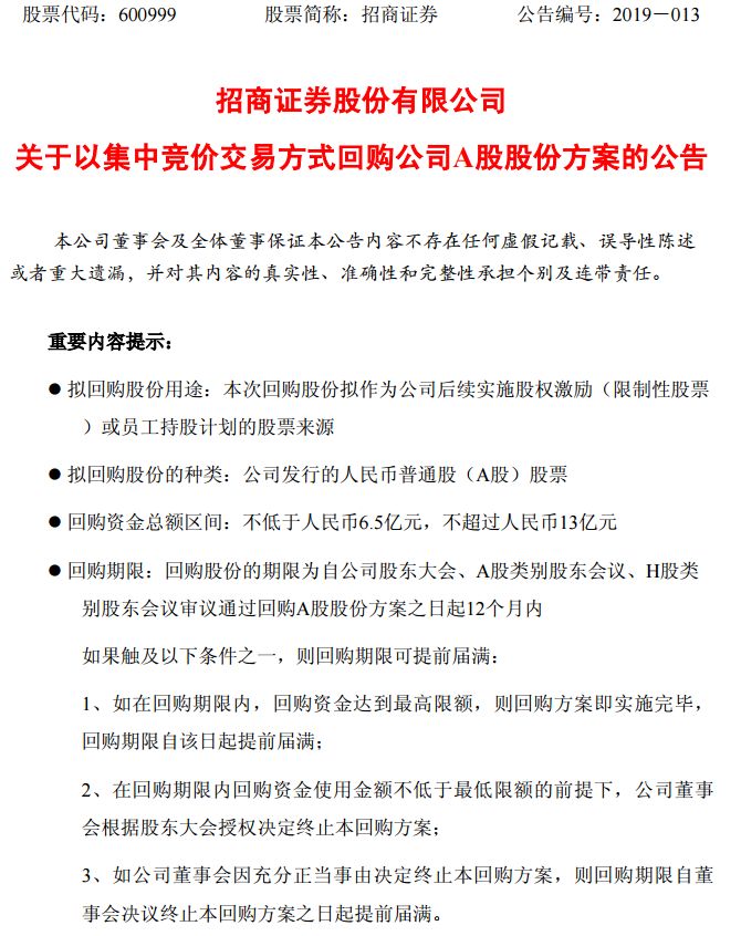 招商证券公告,公司拟回购A股股票,回购金额不低于6.5亿元,不超过13亿元,回购价格不超过26.35元/股。