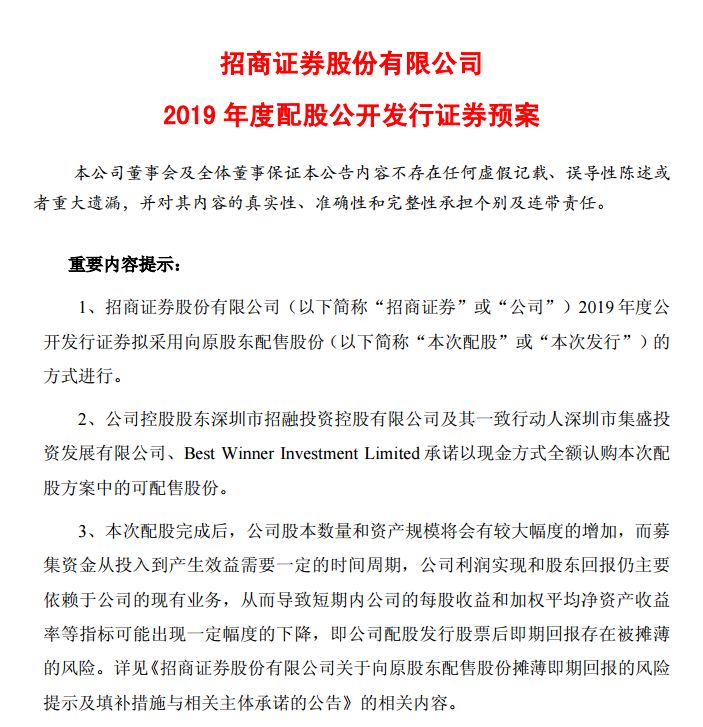 招商证券同日发布公开配股预案,公司拟按照每10股配售不超过3股的比例向全体A股股东配售,配股募资不超150亿元。