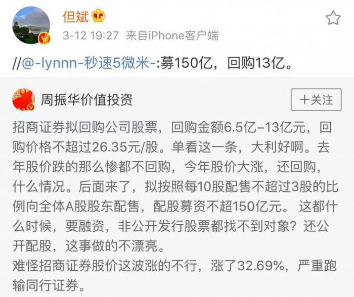本来公司回购股票是大利好,但招商证券同时公告,要拟按照每10股配售不超过3股的比例,向全体A股股东配售股份,募资总额不超150亿元,拟全部用于子公司增资及多元化布局、资本中介业务、资本投资业务、补充营运资金。