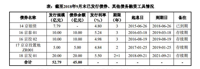 3月11日,京投发展(600683.SH)在上交所发布债券募集说明书,前不久,证监会才核准京投发展向合格投资者公开发行面值总额不超过15亿元的公司债券。募集说明书中显示,本期债券的募集资金拟全部用于偿还公司债务,发行首日为3月13日,期限为5年期。此外,截至2018年9月末,京投发展总计发债规模为 52.79 亿元,债券余额为45.00 亿元,负债率为88.08%。