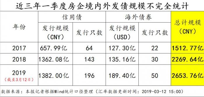 21世纪经济报道记者通过Wind统计口径整理发现,2019年以来,房地产企业境内已发信用债196只,发行规模达1382亿元;内地房企已发行海外债50只,发行规模达189亿美元,较去年1季度增长40%,且有的票面利率已超10%。截至3月12日,2019年房企境内外新发债规模总计约2653.76亿元人民币。