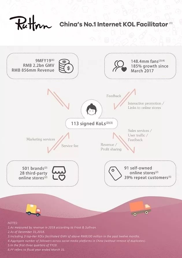 招股书显示,目前如涵有113个签约的网红(KOL、意见领袖)、1.484亿粉丝、91个自营网店(复购用户39%)。