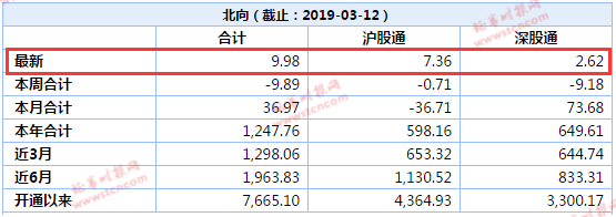 数据显示,3月12日,北上资金逆转此前净流出的态势,单日净流入9.98亿元。其中沪股通净流入7.36亿元,深股通净流入2.62亿元。