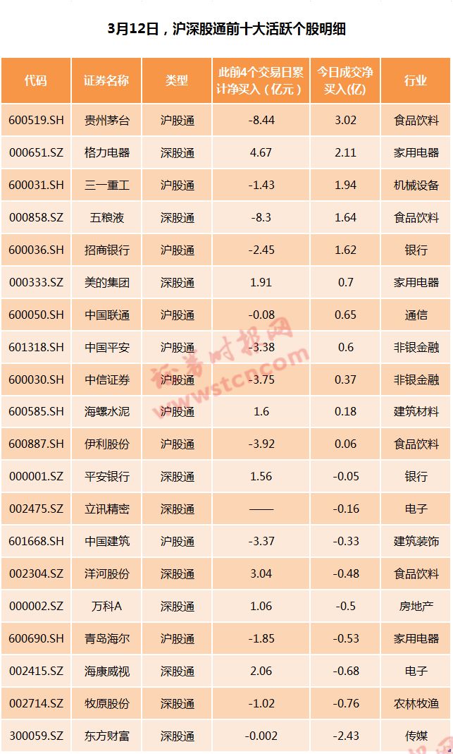 从深股通及沪股通前十大成交活跃股看,3月6日至11日期间有29只个股登上成交活跃榜榜单,成交金额最多的是中信证券,累计成交61.29亿元;中国平安、贵州茅台分列二三位,成交额分别为54.19亿元、51.12亿元,此外,成交金额在20亿元以上的还有五粮液、格力电器、海康威视、美的集团、招商银行、恒瑞医药等。 以净买卖金额统计,3月6日至11日期间上榜个股以净卖出的居多,共有19只。其中,净卖出金额最多的贵州茅台,累计净卖出8.44亿元;五粮液累计净卖出金额达8.3亿元,排名第二;此外,京东方A、伊利股份、兴业银行、中信证券、中国平安、中国建筑、招商银行、中国石化等个股累计净卖出金额也超过2亿元。净买入的个股有9只,海康威视、洋河股份、格力电器等3股净买入金额均超2亿元,此外净买入的个股还有中兴通讯、万科A、平安银行、海螺水泥、恒瑞医药、美的集团和东方财富。