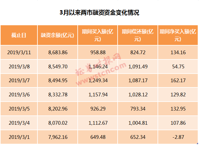 其中,融资余额为8683.86亿元,环比增加134.16亿元。值得注意的是,这已经是融资余额连续第6个交易日实现净流入。其中,3月4日、5日、6日、7日、11日等5个交易日,净买入金额均超过百亿元。
