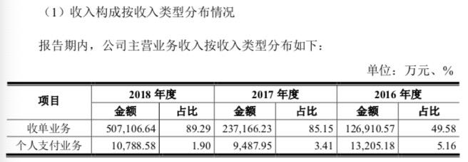 招股书显示,2018年拉卡拉营业收入达到56.79亿元,净利润6.06亿元,其中,收单业务已成为公司营业收入的主要来源,2018年公司收单业务的营业收入占比已达89.29%。