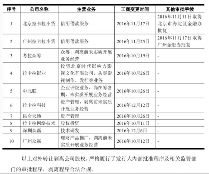 具体来说,拉卡拉通过向联想控股、孙陶然出资设立的西藏考拉及其下属子公司转让公司所持的北京拉卡拉小贷、广州拉卡拉小贷、考拉众筹、拉卡拉影业、中北联、拉卡拉科技、深圳众赢、广州众赢、昆仑天地、拉卡拉网络等10家全资或控股子公司全部股权,并由联想控股及其子公司承接发行人对北京拉卡拉小贷、广州拉卡拉小贷已有全部担保的方式,实施业务剥离。