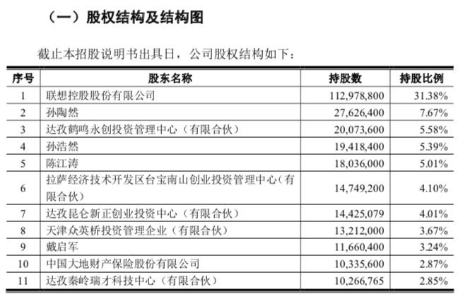 股东方面,截止招股书出具日,持有公司5%以上股份的主要股东包括联想控股、孙陶然、鹤鸣永创、孙浩然、陈江涛,分别持有31.38%、7.67%、5.58%、5.39%、5.01%股份。