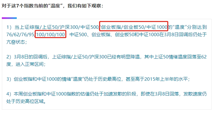 按照市场温度指数,测量了上证综指、上证50、沪深300、中证500、创业板指、创业板50和中证1000一共7种指数的“温度”。过高的市场温度并不影响中期趋势,但大概率带来短期剧烈波动回调。