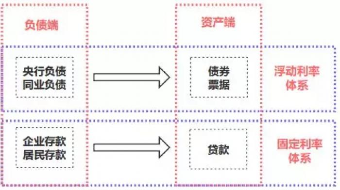 浮动和固定两套利率体系,除了体量不同之外,更重要的不同在于运作方式不同。我们做了一个利率体系的简略图,可以看到,浮动利率体系下,负债端来源是对央行负债或者是对同业负债,资产的投向是债券或者票据。固定利率体系下,负债端来源是企业和居民存款,资产的投向是贷款。可以简单的总结为,浮动利率负债投浮动利率资产,固定利率负债投固定利率资产。