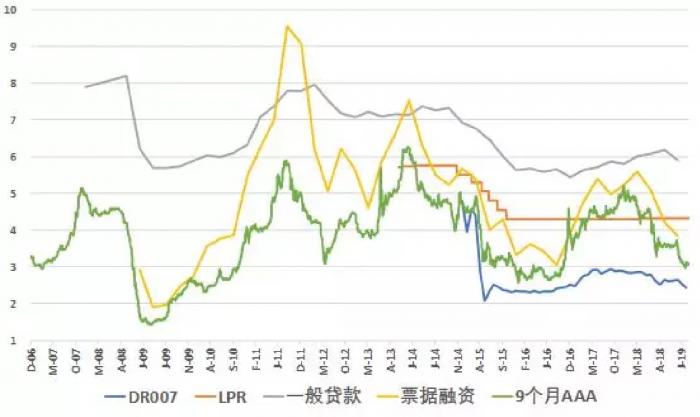 现在我们回到第二个问题,利率“两轨合一轨”能否解决政策利率传导不畅的问题?我们先来看看,几个最重要的利率。从下图可以看出,票据融资利率、9个月AAA债券利率,和DR007(存款类金融机构7天回购利率)的变动是基本一致的,因为他们都归属于浮动利率体系。