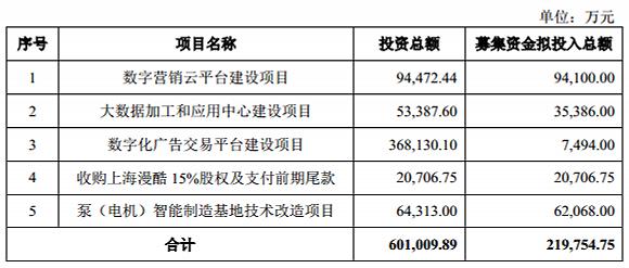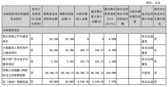 资料显示,利欧股份可转债所融资金的投项有5个,即“数字营销云平台建设项目”、“大数据加工和应用中心建设项目”、“数字化广告交易平台建设项目”、“收购上海漫酷15%股权及支付前期尾款”、“泵(电机)智能制造基地技术改造项目”,计划的建设期除第四个项目全部为2年。另据2018年半年报显示,除了第四个项目完成了之后,其余项目的完成度都非常低,其中“数字营销云平台建设项目”的进度甚至为0%,倒有些耐人寻味。