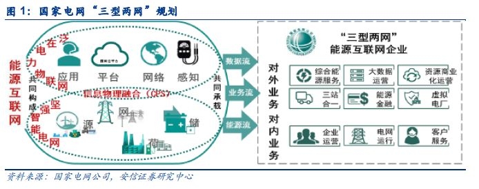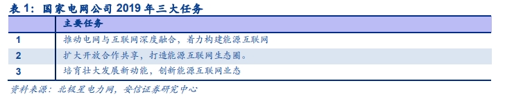 能源互联网=坚强智能电网+泛在电力物联网。2019 年 1 月,国网工作会议正式提出建设枢纽型、平台型、共享型企业,在坚强智能电网基础上建设泛在电力物联网,共同构成能源流、业务流、数据流“三流合一”的能源互联网。同时,国网公司提出了 2019 年度三大发展任务: