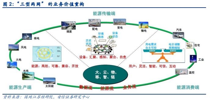 三重挑战,加速电网公司业务发展转型与泛在电力物联网推出。当前来看,电网企业正面临电网形态复杂化、电力市场化倒逼、数字化经济打造多边市场等三重挑战。通过两网融合建设,实现电力流、数据流贯穿能源生产、传输、消费全过程,泛在电力物联网成为电网应用 和社会应用的桥梁,平台成为电网公司核心竞争力。在泛在电力物联网的框架下,电网常规 业务和战略新兴业务都在数据流的支撑下,不断优化价值流向,通过资源共享共用推动能源 生态圈价值共创。