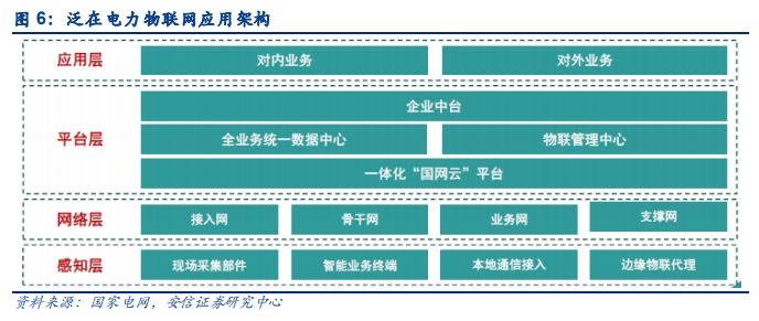 泛在电力物联网包含感知层、网络层、平台层、应用层 4 层结构。感知层设备既包括电力采 集类的电表、互感器、集中器等,也包括电力二次设备涉及的各类终端,在未来泛在电力物 联网领域还将包括温度、湿度、烟雾等非电类感知设备。在网络刚包括网关、专网、广域网、 数据中心等传输层设备。