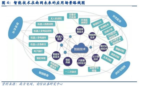 南方电网公司也在积极推动智能技术在电网领域的应用。2018 年 5 月 11 日,南方电网正式印发的《智能技术在生产技术领域应用路线方案》,对新一代智能技术产业进行了全景式分析,规划了智能技术(包括云计算、大数据、物联网、移动互联网、人工智能等)在南方电 网公司生产领域的智能装备、现场作业、状态监测、态势感知和智慧运行五个领域的应用前 景。