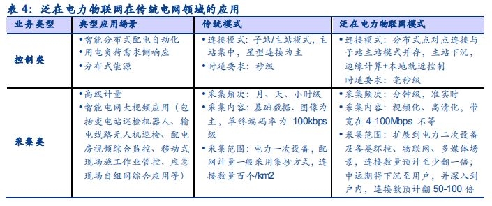 其中,控制类包含能分布式配电自动化、用电负荷需求侧响应、分布式能源调控等;采集类主要包括高 级计量、智能电网大视频应用。未来在泛在电力物联网应用场景下,控制领域将从当前的星 型集中连接模式向点到点分布式连接切换,主站系统将逐步下沉,出现更多的本地就近控制 和边缘计算。