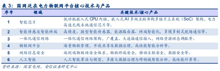 泛在电力物联网平台的核心技术与产品涉及 6 个领域。国网泛在电力物联网建设内容包括对 内业务、对外业务、数据共享、基础支撑、技术攻关和安全防护 6 个方面和 11 个重点方向。 泛在电力物联网涉及的关键核心技术与产品,主要包括以下 6 个领域: