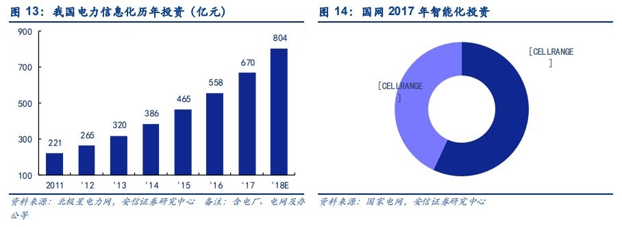 国网智能化投入有望加速。2017 年国网智能化投资 124 亿元,其中信息化和通信分别投资 53 亿和 70 亿,同比分别增 7.5%和 15%。到 2018 年底,国网公司建成全球规模最大的电 力专用通信网,光缆总长达 152.08 万千米,设备 52.77 万台/套,站点 8.8 万座,骨干网带 宽 400Gbps,承载各类业务通道 40.32 万余条。考虑到泛在电力特联网全面建设即将展开, 我们预计,未来几年电网智能化投资金额与占比有望同时快速提升。