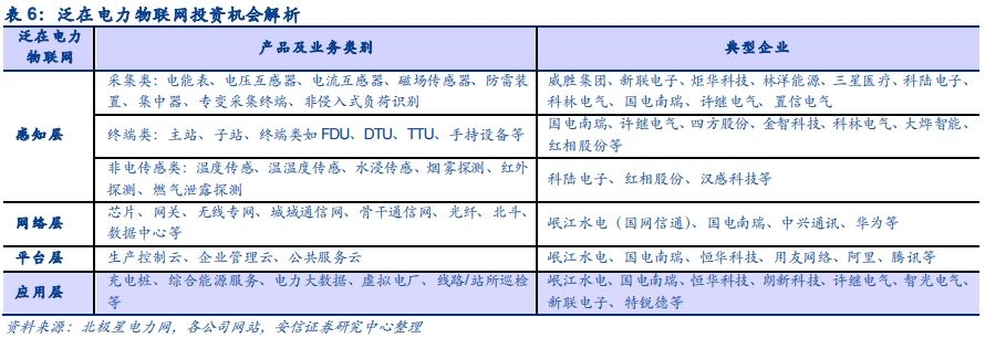 从受益的节奏与体量来看,我们认为首先受益的当属具备泛在电力物联网整体解决方案综合 实力的国网系信通产业单元,如国网信通产业集团和国电南瑞;其次为在电力信息化相关领 域深耕多年的电力二次设备企业和相关软件企业,如许继电气、金智科技、新联电子、恒华 科技、朗新科技等;再次为传感监测类及相关应用类的企业,如炬华科技、红相股份、远光软件等。