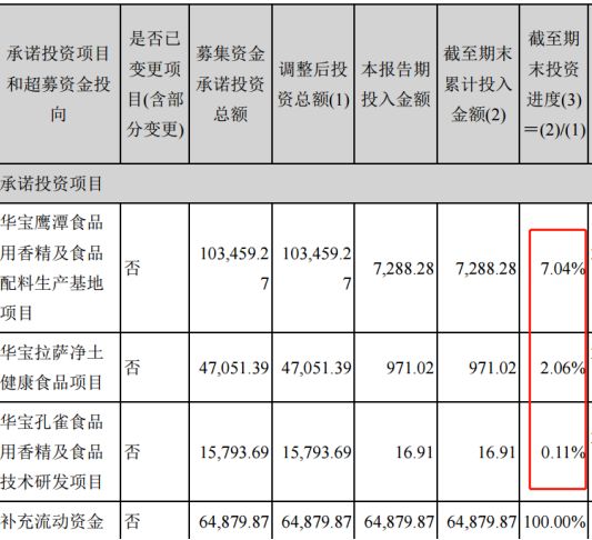 反应在投资项目上,除了“补充流动资金”的投资已完成外,华宝鹰潭食品用香精及食品配料生产基地项目的投资进展只有7.04%,华宝拉萨净土健康食品项目投资进度只有2.06%,华宝孔雀食品用香精及食品技术研发项目的投资进度只有0.11%。