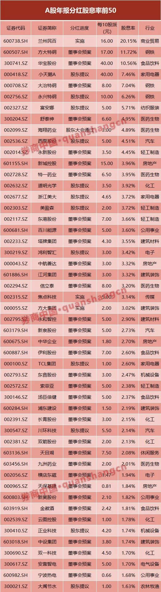 兰州民百:10派16元,股息率20.15%,已实施; 方大特钢:10派17元,股息率11.72%; 小天鹅A :10派40元,股息率7.46%; 大冶特钢:10派8元,股息率7.04%。