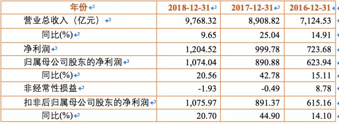 股价的飙涨离不开中国平安靓丽的业绩支撑。2018年,中国平安实现总营业收入9768.32亿元,同比增长9.6% ;归属于母公司股东的净利润1074.04亿元,同比增长20.6%。