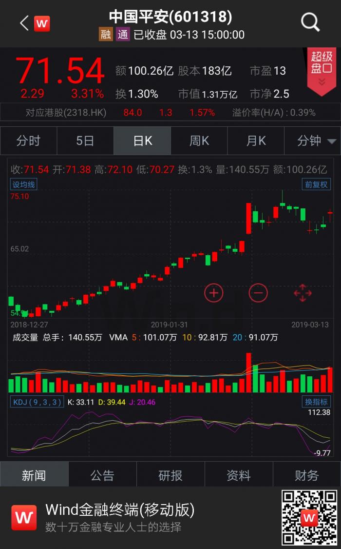 3月13日,中国平安股价大涨3.31%。报收于71.54元/股,总市值一举突破1.31万亿。截至目前,2019年以来中国平安已累计上涨26.52%。