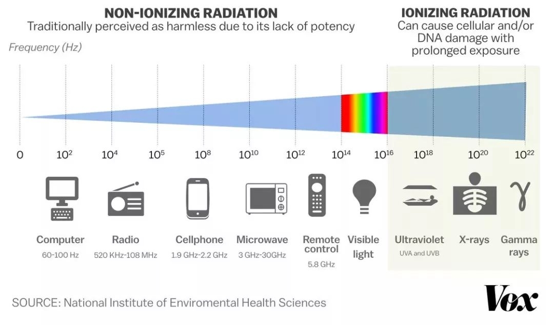 也就是说,它们的辐射——严格一点叫“非电离射频辐射(non-ionizing radio-frequency radiation)”,其实能量都比较低。