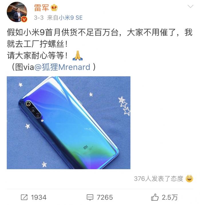 紧接着3月3日,雷军又发微博表示,假如小米9首月供货不足百万台,他将去工厂拧螺丝。
