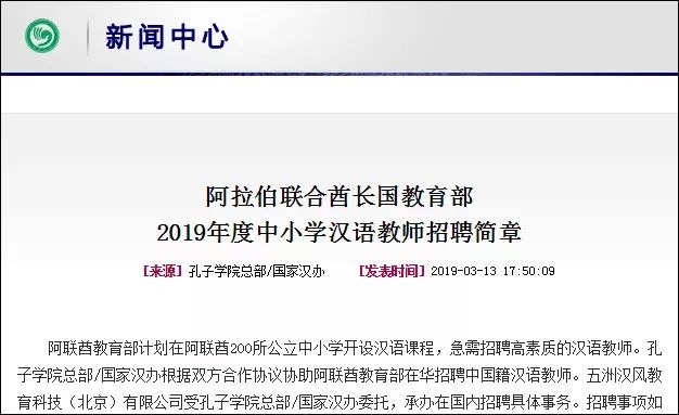 据孔子学院总部/国家汉办网站消息显示,阿联酋教育部计划在阿联酋200所公立中小学开设汉语课程,急需招聘高素质的汉语教师。孔子学院总部/国家汉办根据双方合作协议协助阿联酋教育部在华招聘中国籍汉语教师。阿联酋教育部将提供月薪16000迪拉姆(约合30000元人民币,1迪拉姆=1.83元人民币),无需缴纳个人所得税。