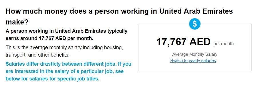 按照国外研究全球各地工资的网站Salary Explorer给出的数据,不考虑具体行业,2019年,一个在阿联酋工作的人平均每月能拿到17767迪拉姆。