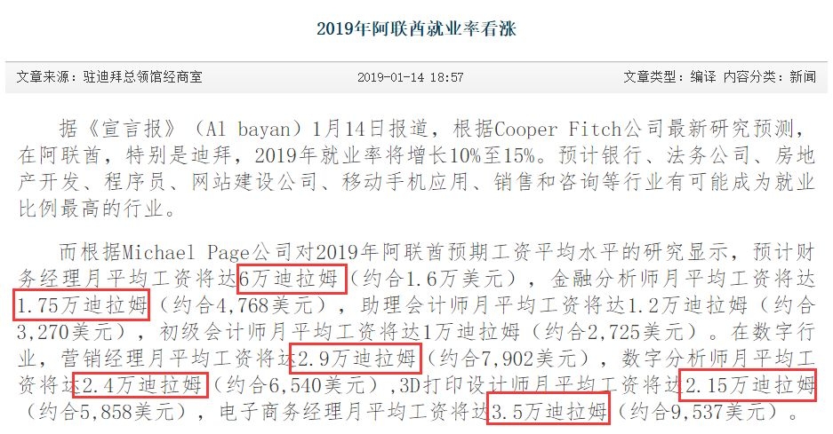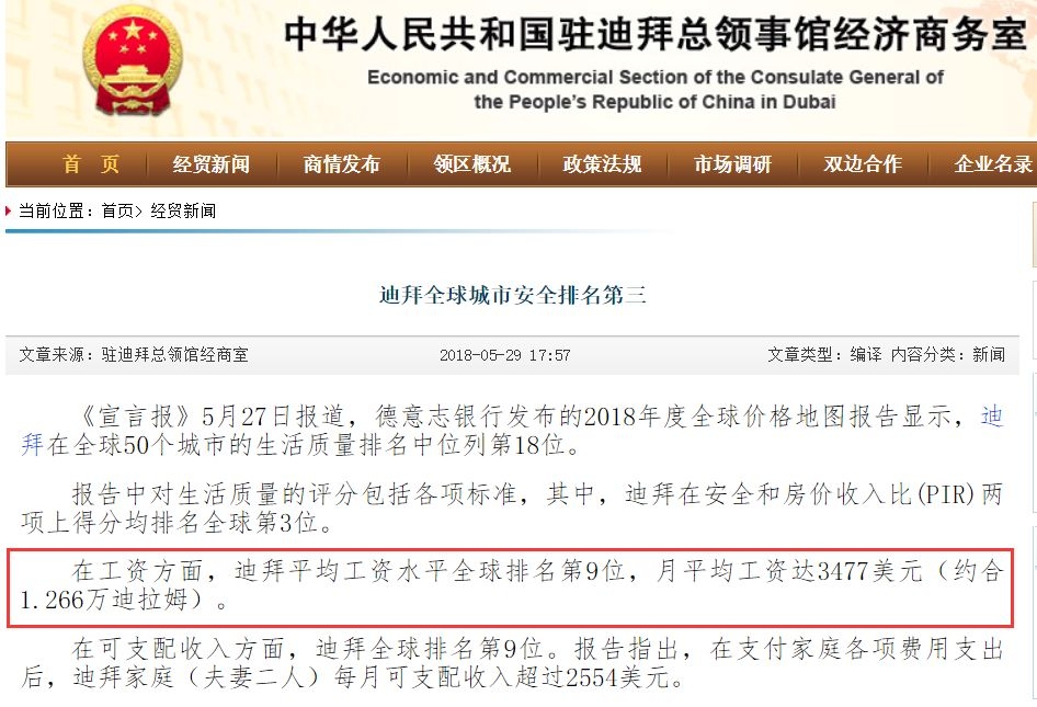 去年5月,我国驻迪拜总领事馆经济商务室在网站上刊载的一则当地媒体报道称,(2018年前后)迪拜月平均工资约为12660迪拉姆。