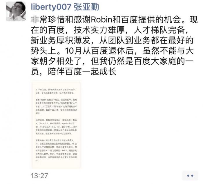 在过去几年间,亚勤和家人不在一个城市,陪伴的时间很少,在多年投入地工作之后,他希望可以更多地和家人在一起。在此我们理解并同意亚勤的选择,感谢他过去的辛勤奉献,并祝福他未来生活美好、身体健康、阖家幸福。亚勤永远都是百度大家庭的一员!我也想借此机会,感谢所有辛苦付出、做出贡献的百度同学,感谢每一位曾经在百度公司工作过的同事。