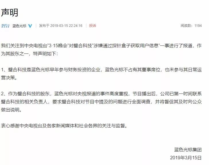 蓝色光标今日晚间刚刚公告称,公司关注到中央电视台“3·15晚会”对璧合科技“涉嫌通过探针盒子获取用户信息”一事进行了报道,作为其股东之一,特声明如下: