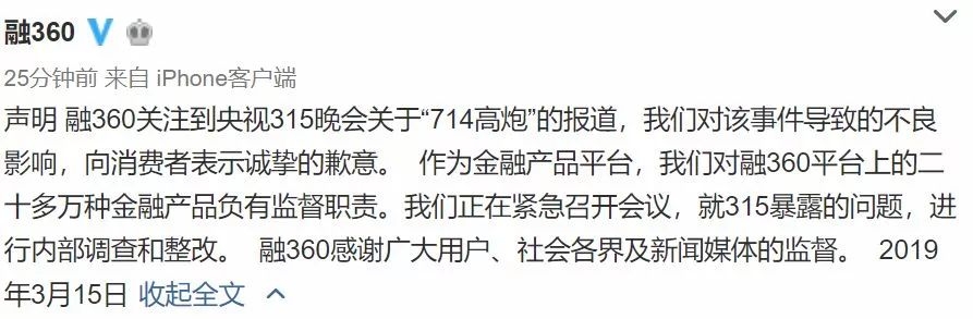 融360发布声明称,关注到央视315晚会关于“714高炮”的报道,我们对该事件导致的不良影响,向消费者表示诚挚的歉意。作为金融产品平台,我们对融360平台上的二十多万种金融产品负有监督职责。我们正在紧急召开会议,就315暴露的问题,进行内部调查和整改。