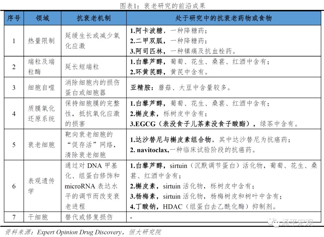 细胞自噬。细胞自噬即细胞内的损伤蛋白或细胞器被溶酶体降解并循环利用的过程,与细胞的生长、发育、衰老及癌变相关,其发现者于2016年获得诺贝尔医学奖。研究发现,细胞自噬的激活具有抗衰老功能,目前发现的细胞自噬激活剂以亚精胺为主,其延长寿命的作用已在小鼠中被证实。亚精胺广泛存在于动植物体内,食物来源包括蘑菇、豆类等。