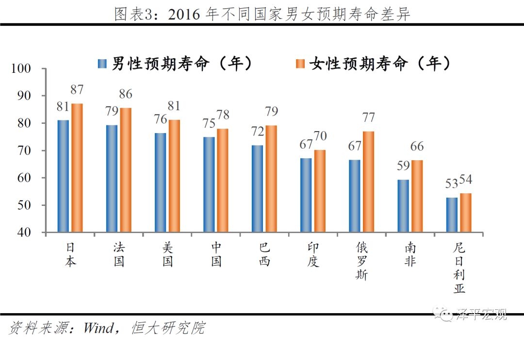 遗传差异包括性别差异、种族差异和个体差异,三者均对寿命有较大影响。种族差异方面,美国各个族裔的寿命差异最大达到了12年,其中亚裔人最为长寿,说明了黄种人基因在寿命方面的优势;性别差异方面,各个国家女性预期寿命均比男性长,全球平均长4.4年;个体差异方面,同卵双胞胎之间的寿命相关性大于异卵双胞胎,基因差异对于个体寿命的影响毋庸置疑,拥有长寿基因的个体更有可能长寿。
