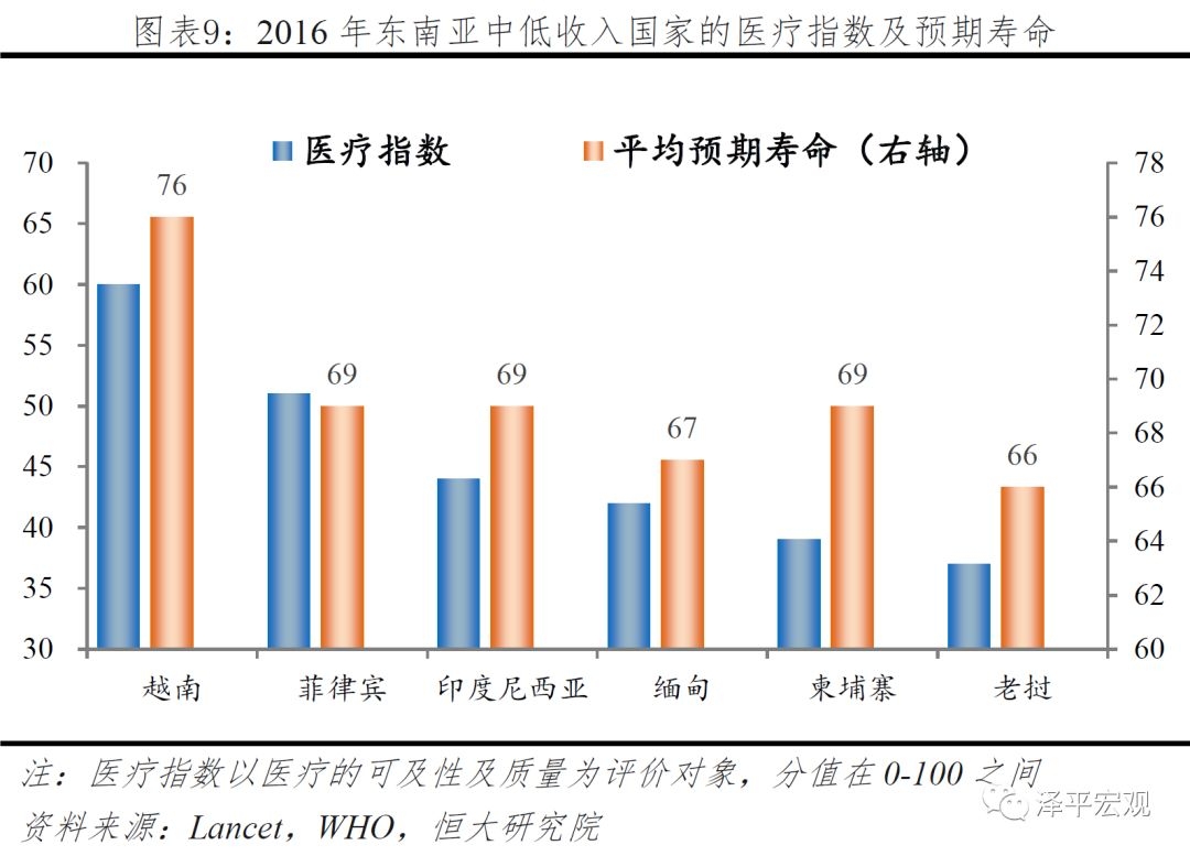 医疗科技的发展是推动人类寿命延长的重要因素,历史上疫苗、抗生素的发明均大幅提升了人类平均寿命,近年来不断创新的医疗技术正帮助人类逐步攻克癌症等重大疾病,人类寿命有望进一步延长。从实证角度出发,越南、菲律宾、印度尼西亚、缅甸、柬埔寨和老挝同为东南亚国家,种族、气候差异不大,经济发展水平也较为相近,人均GDP均介于1000-4000美元之间,因此医疗可及性和质量成为影响寿命的关键因素,数据显示医疗指数与平均预期寿命基本呈现正相关关系。