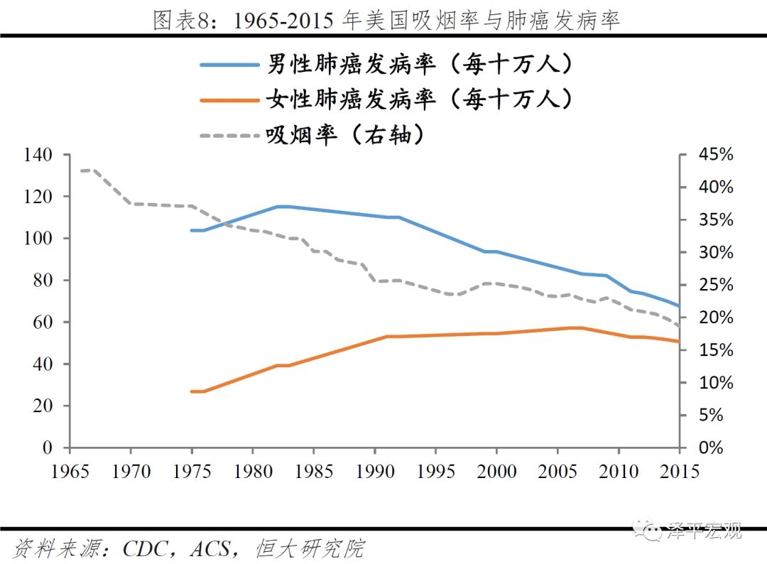 嗜好方面,吸烟、酗酒、高危性行为等对健康危害巨大。美国自上世纪60年代开始控烟运动,包括在香烟制品上强制印刷健康警示、禁止香烟广告、公共场所限制吸烟、大幅提高香烟价格及健康宣传等,吸烟率从40%持续降低到18%,80年代开始美国男性肺癌发病率大幅下降,美国疾控中心将肺癌发病率下降的90%归功于控烟运动。