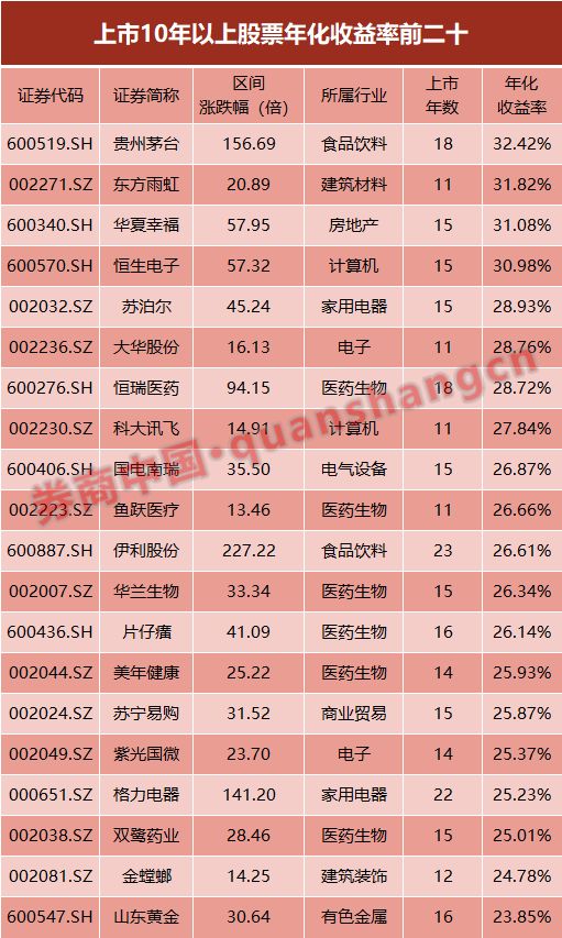 如果以年化收益来看,上市超过十年的股票中,贵州茅台的年化收益最高,达到32.42%,这也是为什么茅台一直是A股投资者最为喜爱的股票,成长足够快;东方雨虹、华夏幸福、恒生电子的年化收益率也均超过30%,排在二至四位。