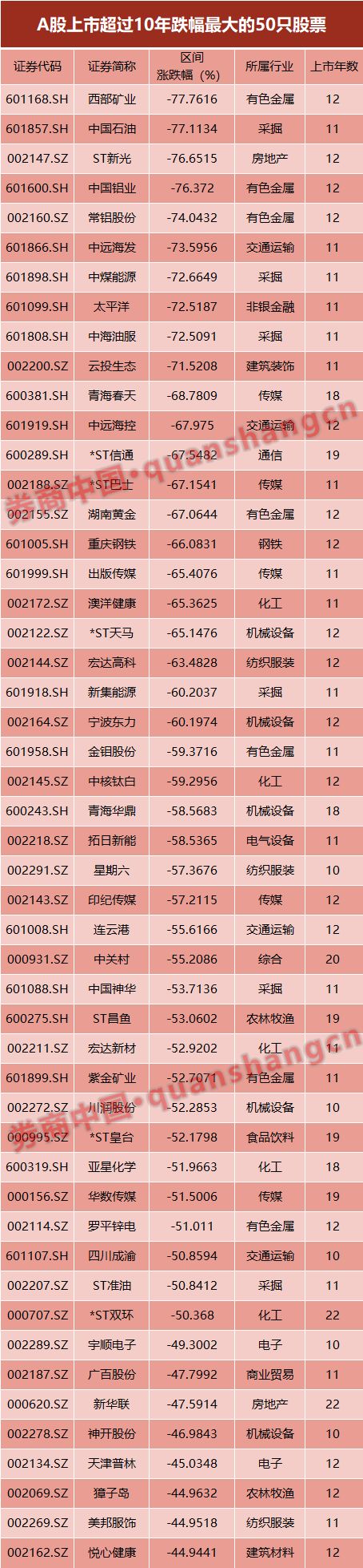 数据显示,西部矿业是两市表现最差的股票,上市至今跌幅高达77.76%,成为上市超过十年的股票中的第一熊股;排名第二的则是鼎鼎大名的中石油,上市至今跌幅高达77.11%;ST新光跌幅达76.65%,位居第三。