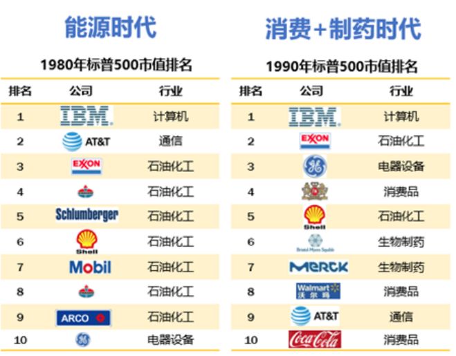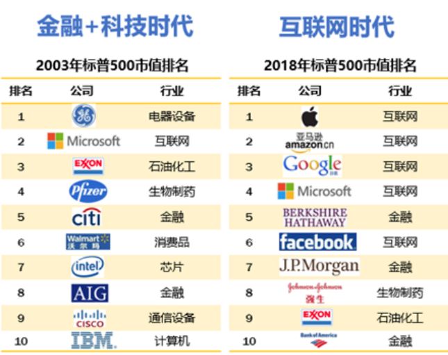 再来看美国,1980年为能源时代,市值前十里几乎全是石油化工;1990年,则是消费+制药时代;到了2003年,则演变成金融+科技;而到了2018年,则市值前十里几乎全是互联网公司,苹果、亚马逊、谷歌和微软等排在全球前四位。