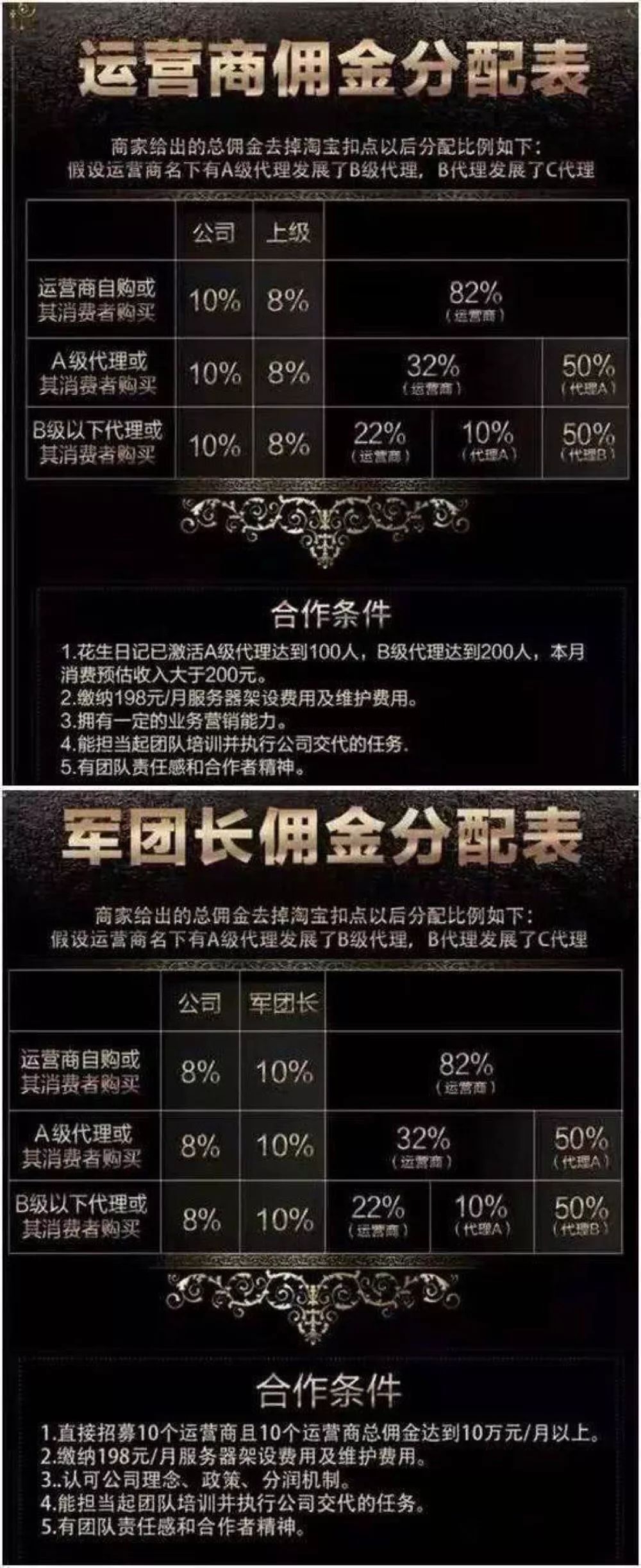 据披露,花生日记的运营商大部分为自然人,主要来源于两个途径:一是分公司直接将名下有“流量”的成员发展成运营商;二是超级会员成长值达达到5000点、自愿升级做运营商,升级后与原上级运营商脱钩,其之前发展的会员全部转为下级,成为新链条,按运营商规则提取佣金。