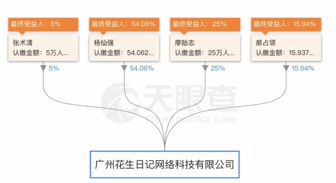 天眼查信息显示,花生日记4位股东均为自然人,创始人杨仙强作为实际控制人持股54.06%。