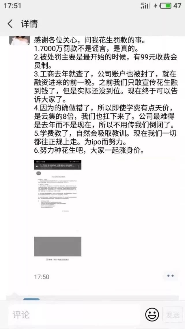 随后,一位疑似花生日记员工在微信朋友圈谈及公司被处罚的事实,言语中似乎确认融资款项已到位,还称“公司最难的是去年而不是现在”,否认倒闭传言,并表示“为IPO而努力,一起涨身价”。
