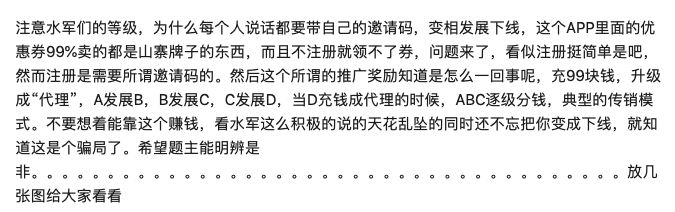 在2017年7月28日至2018年1月15日间,花生日记规定会员只能领取平台优惠券,超级会员和运营商才能获得发展下线并从下线人员消费金额中提取佣金的资格,而会员升级成超级会员需交纳99元费用。