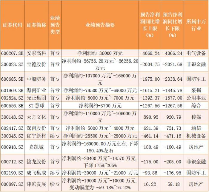 在亏损的13股中,安彩高科、宝德股份、中船防务等10家净利润预计同比减少超过1000%。